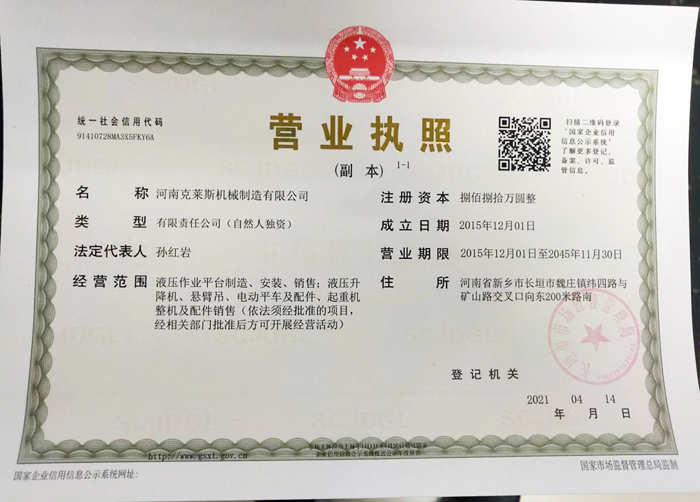 河南克萊斯機械制造有限公司位于河南省長垣市魏莊工業園區,公司注冊資金捌佰捌拾萬元整,在職員工40余名,擁有研發設計團隊,是一家生產液壓升降作業平臺及旋臂起重機生產銷售的廠家?! 」局饕a品有:固定導軌式液壓升降作業平臺、移動式液壓升降平臺、車載式液壓升降平臺;定柱式懸臂吊、墻壁吊、電動平車、登車橋等。  精良的設備,嚴格的管理是公司得以不斷發展壯大、產品能夠贏得用戶依賴的根本所在。  “精確、...... <了解更多>